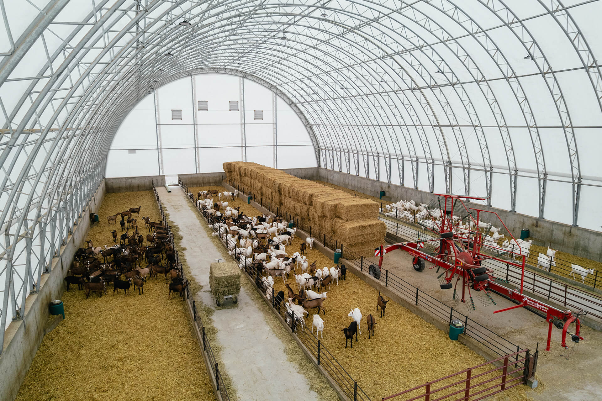 C’est dans ce contexte que Caprijol a décidé d’installer deux dômes Britespan sur sa ferme, un choix qui reflète parfaitement son approche agricole. En 2022, un premier dôme du modèle Apex, de 60 x 104 pieds, a été érigé pour l’entreposage de 1 500 balles de paille. Bâti sur des blocs de béton et un fond de gravier, ce premier bâtiment offre une capacité d’entreposage impressionnante, permettant de sécuriser les besoins annuels du troupeau. Épatés par ce premier projet, un deuxième dôme du modèle Atlas de 80 x 144 pieds est installé afin d’accueillir 600 chevrettes. Cette structure offre aux animaux un grand parc lumineux, spacieux et confortable, où ils bénéficient d’une qualité de vie optimale dans un environnement où les normes de bien-être animal sont placées au cœur des priorités. Sans mécanismes dispendieux et complexes, ces infrastructures répondent parfaitement aux besoins de simplicité et de faible coût de la ferme. Elles transformeront la gestion quotidienne des activités, tout en soutenant une hausse de 30 % du chiffre d’affaires annuel de l’entreprise.